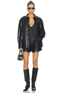 - Self: 48% leather 27% polyurethane 25% polyester Lining: 100% polyester - Made in China - Hand wash cold - Zip fly with hook closure.4-pocket styling - Shorts measure approx 14" in length - Revolve Style No. ANIN-WF58 - Manufacturer Style No. A-05-11184-BLK26