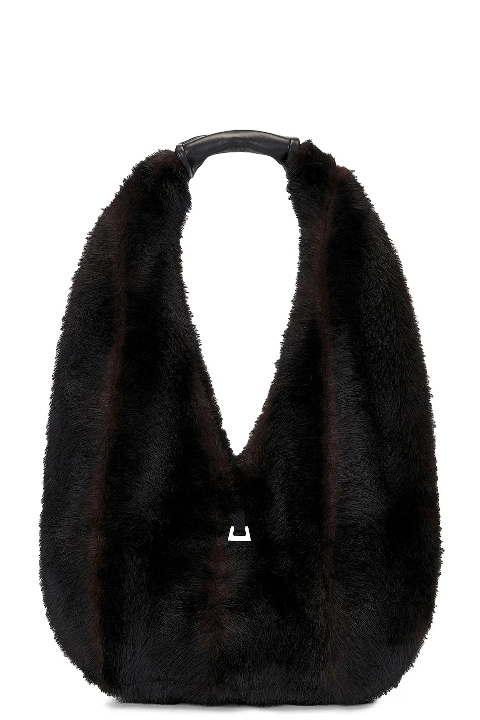 - Recycled faux mink fur with a bonded, faux suede lining and detachable SANS Leather strap - Made in China - Magnetic snap closure - One main compartment.1 interior slip pocket - Measures approx 13.25" W x 18.75" H x 3" D Top handle with a 11" drop - Revolve Style No. APRS-WY2 - Manufacturer Style No. F5BG279NML