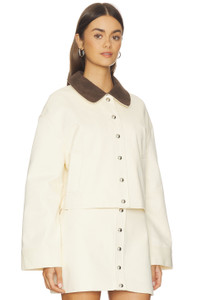 - Self: 100% cotton Faux Suede: 100% polyurethane Lining: 100% polyester - Made in China - Dry clean - Front snap button closure - Heavyweight canvas fabric - Cropped fit - Contrast faux suede collar detail - Revolve Style No. APRS-WO191 - Manufacturer Style No. O6JC386OWDB