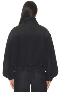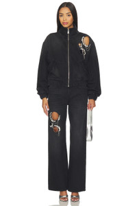 - 100% cotton - Machine wash - Front zipper closure - Rigid deni8m - Cut outs with draped crystals - Elastic hem - Revolve Style No. ARRE-WO4 - Manufacturer Style No. FW25AWOU0054DE02