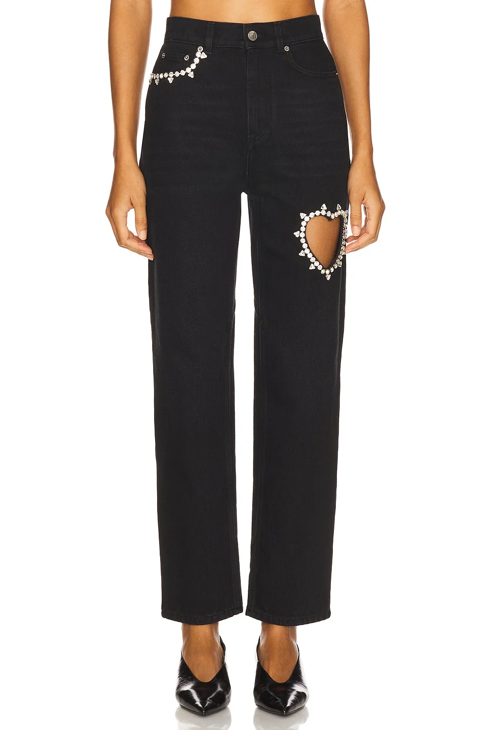 - 100% cotton - Machine wash - Zip fly with button closure - Four pocket styling - Heart cut-out with gemstone trim details - Heart seam design at back - Leg opening measures approx 15" - Revolve Style No. ARRE-WJ7 - Manufacturer Style No. 0000PA0069DE02