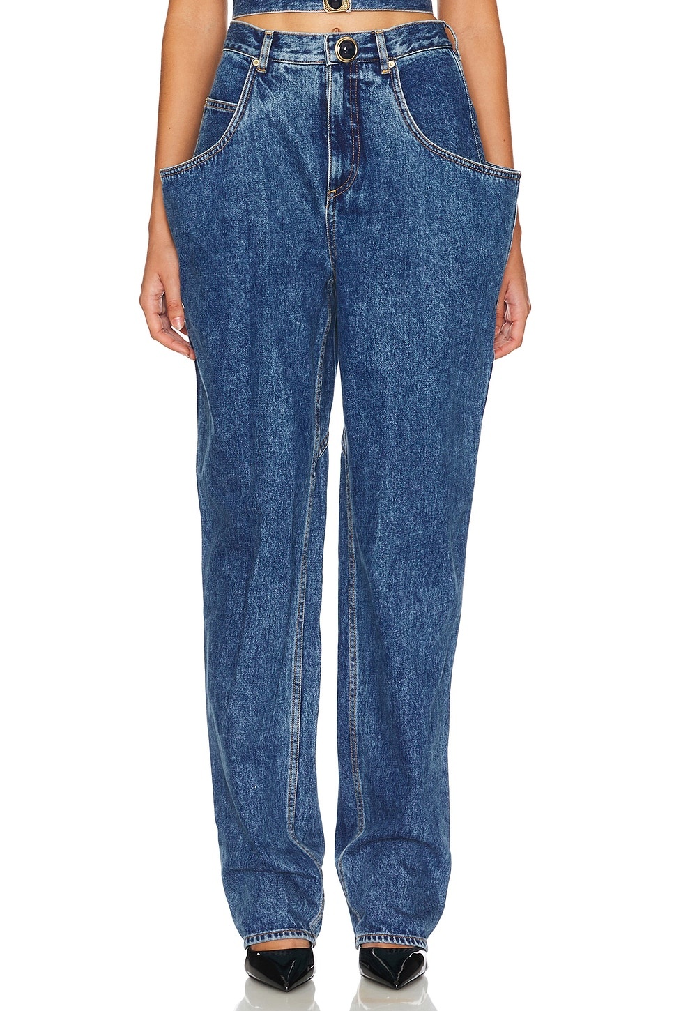- 100% cotton - Made in China - Dry clean only - Zip fly with hook and eye closure Gemstone button - Flare pockets - Back heart design with single pocket.20" at the knee narrows to 14" at the leg opening - Revolve Style No. ARFE-WJ21 - Manufacturer Style No. FW24AWPA0032DE01