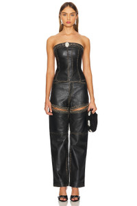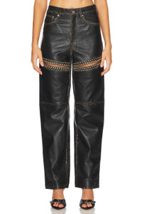 - Self: 100% leather Lining: 100% viscose - Made in India - Dry clean only - Zip fly with button closure.3-front pockets - Back heart design with single pocket Aged silver tone stone at waist - Slit thigh with stud trim Item not sold as a set.18" at the knee narrows to 15" at the leg opening - Revolve Style No. ARFE-WP62 - Manufacturer Style No. FW24AWPA0039LE01