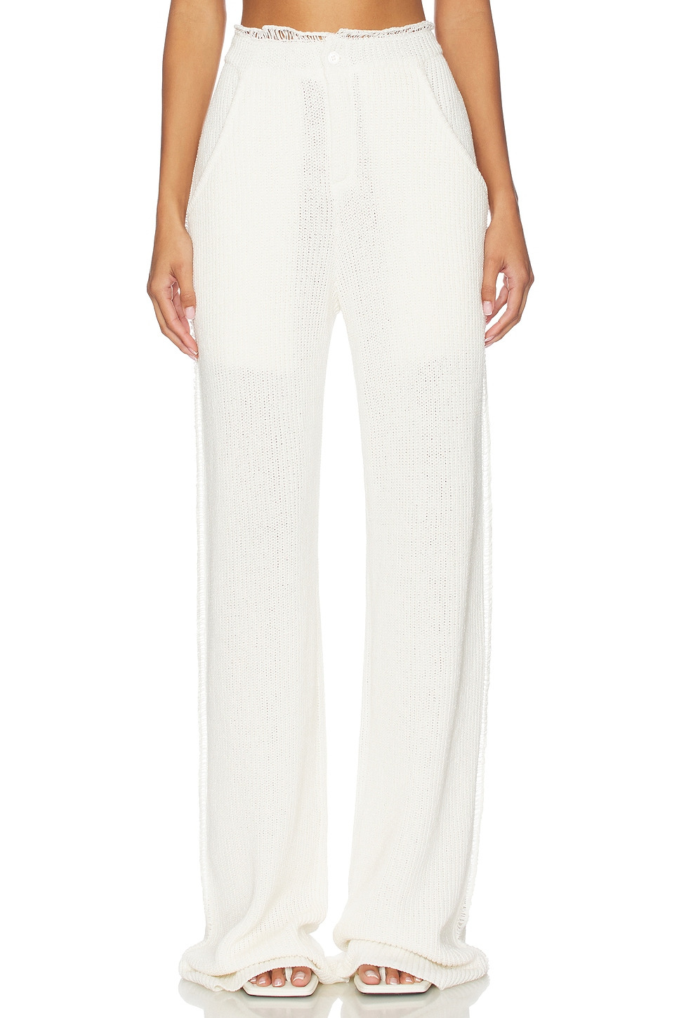 - 41% Linen, 34% Cotton, 25% Nylon - Dry Clean - Zipper fly with button closure - Fringe-like detail at waist and sides - Front and back pockets.26" at the leg opening - Revolve Style No. AYAR-WP40 - Manufacturer Style No. AMPF2546