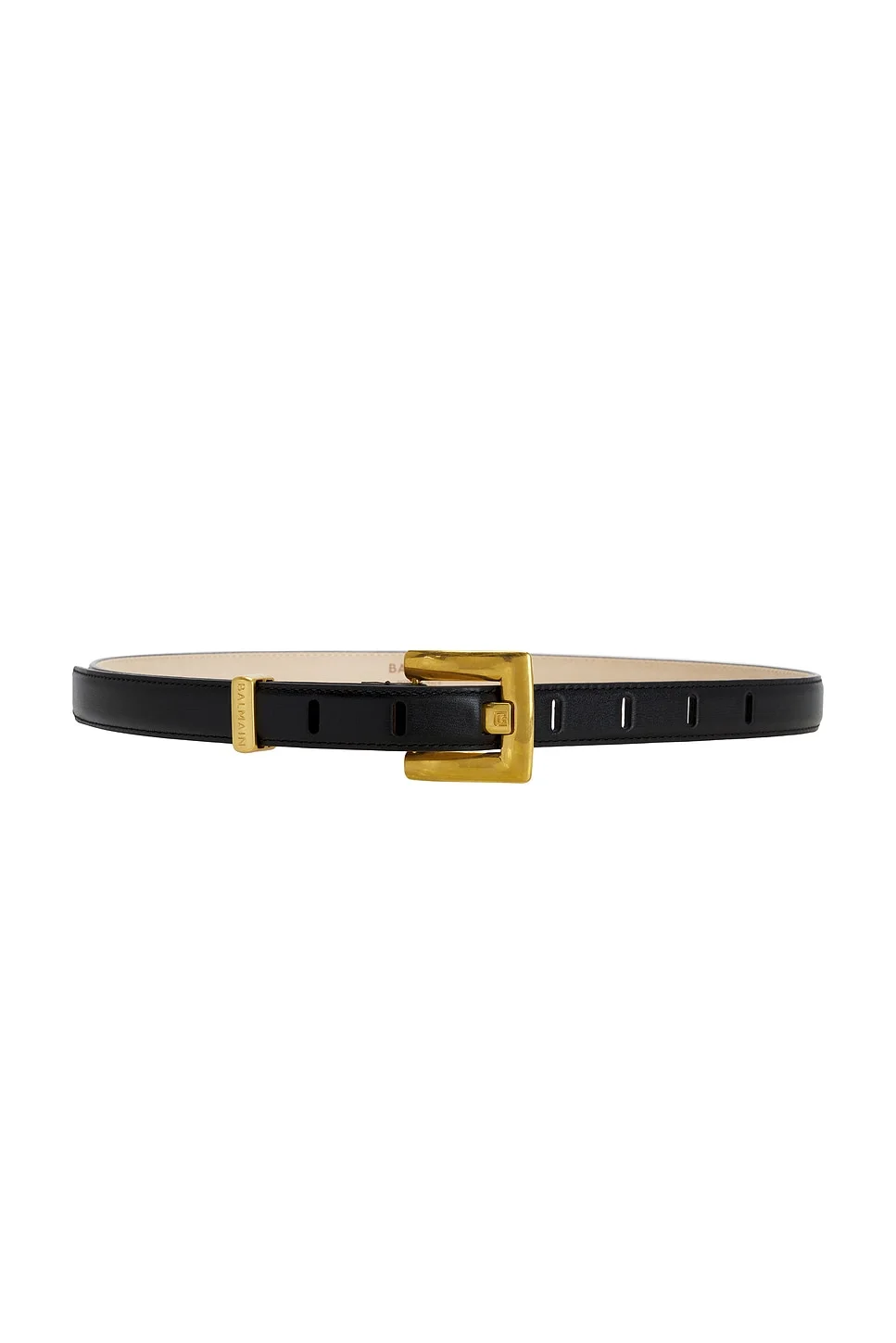 - Genuine calfskin leather belt - Gold-tone metal buckle closure - PB-engraved prong - Measures approx 0.78" W - Revolve Style No. BLMR-WA3 - Manufacturer Style No. GN1WJ191LSLX