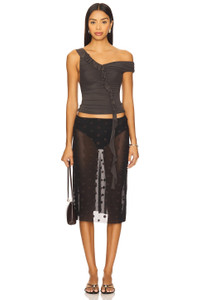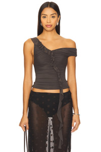 - 93% polyester 7% elastane - Machine wash - Pull-on styling - Off-shoulder design - Mesh fabric with draped ruffle accent - Revolve Style No. BECA-WS159 - Manufacturer Style No. S25-21890