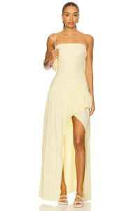 - Self: 95% nylon 5% elastane Lining: 100% polyester - Machine wash - Partially lined - Pull-on styling with elastic overbust band - Ruffled asymmetric hem - Midweight shell fabric - Neckline to shortest hem measures approx 23.5" and to longest hem approx 56.5" in length - Revolve Style No. BECA-WD755 - Manufacturer Style No. W25-13036