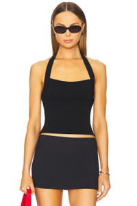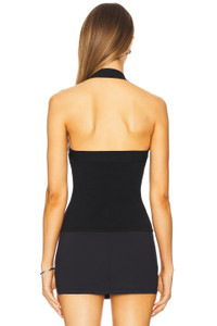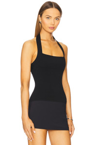 - Self: 83% viscose 17% polyester Contrast Fabric: 76% viscose 16% polyester 8% elastane - Hand wash cold - Halterneck styling with ribbed trim - Midweight knit fabric - Revolve Style No. BECA-WS149 - Manufacturer Style No. A25-21684