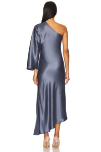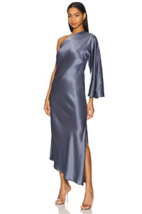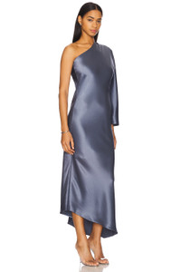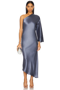 - Self: 76% acetate 24% polyester Lining: 100% viscose - Machine wash - Partially lined - Pull-on styling - One-shoulder styling - Satin fabric with side slit - Revolve Style No. BYMA-WD88 - Manufacturer Style No. 103093