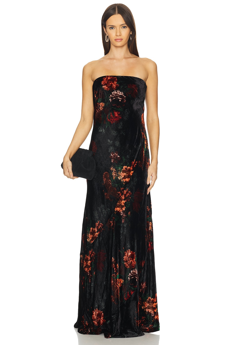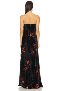 - Self: 82% rayon 18% silk :Lining: 100% polyester - Made in China - Dry clean only - Fully lined - Back zipper closure - Built-in bra with elastic band and clasp - Crushed velvet material - Neckline to hem measures approx 55" in length - Revolve Style No. CCAR-WD38 - Manufacturer Style No. 1447