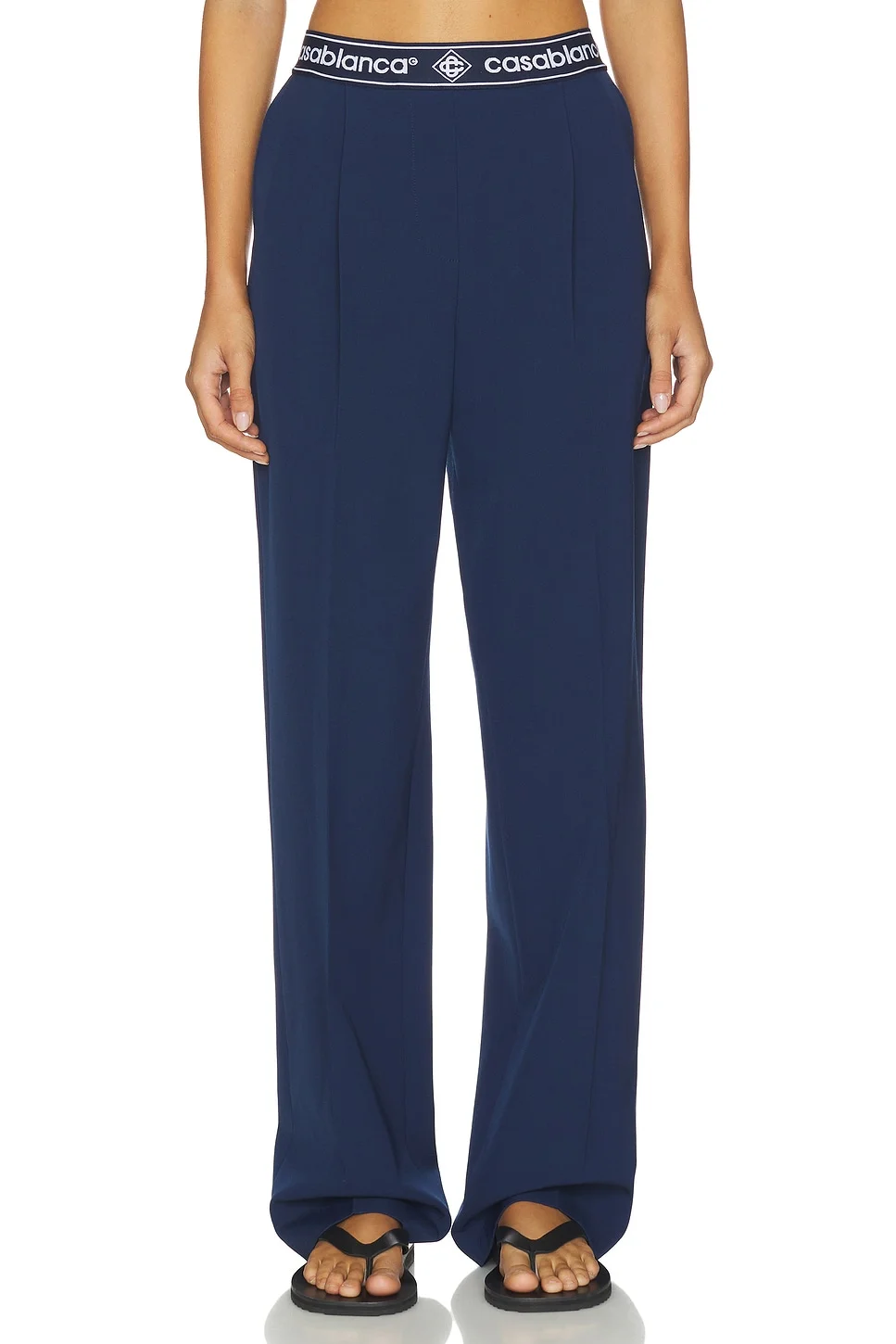 - Self: 55% polyester 43% wool 2% elastane Contrast Fabric: 95% recycled polyester 5% elastane - Made in Portugal - Dry clean - Hidden side zip with hook and eye closure - Midweight twill fabric - Logo graphic detail at waistband - Dual side seam pockets.18" at the leg opening - Revolve Style No. CASB-WP9 - Manufacturer Style No. W-SP26-TR-391-01
