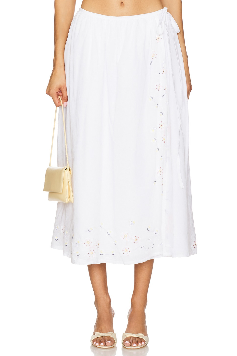 - 100% cotton - Made in India - Machine wash cold - Fully lined - Self-tie wrap closure - Floral design with contrast colored threading - Item not sold as set - Skirt measures approx 33" in length - Revolve Style No. CIAR-WQ5 - Manufacturer Style No. 10594127WHT
