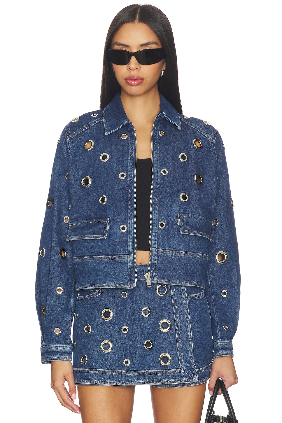 - 59% cotton 40% lyocell 1% elastane - Machine wash - Front zip closure - Front flap pockets - Intentional fading - Intentional fading with allover silver-tone grommet detailing - Heavyweight denim fabric - Item not sold as a set - Revolve Style No. CINR-WO142 - Manufacturer Style No. ZJ76311175Z