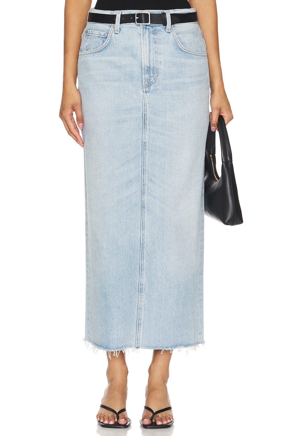 - 100% regenerative cotton - Made in USA - Machine wash - Unlined - Zip fly with button closure.5-pocket design Frayed raw-cut hem - Light whiskering and fading detail Midweight denim fabric with back vent - Skirt measures approx 36" in length - Revolve Style No. CITI-WQ57 - Manufacturer Style No. 3182-3041