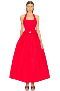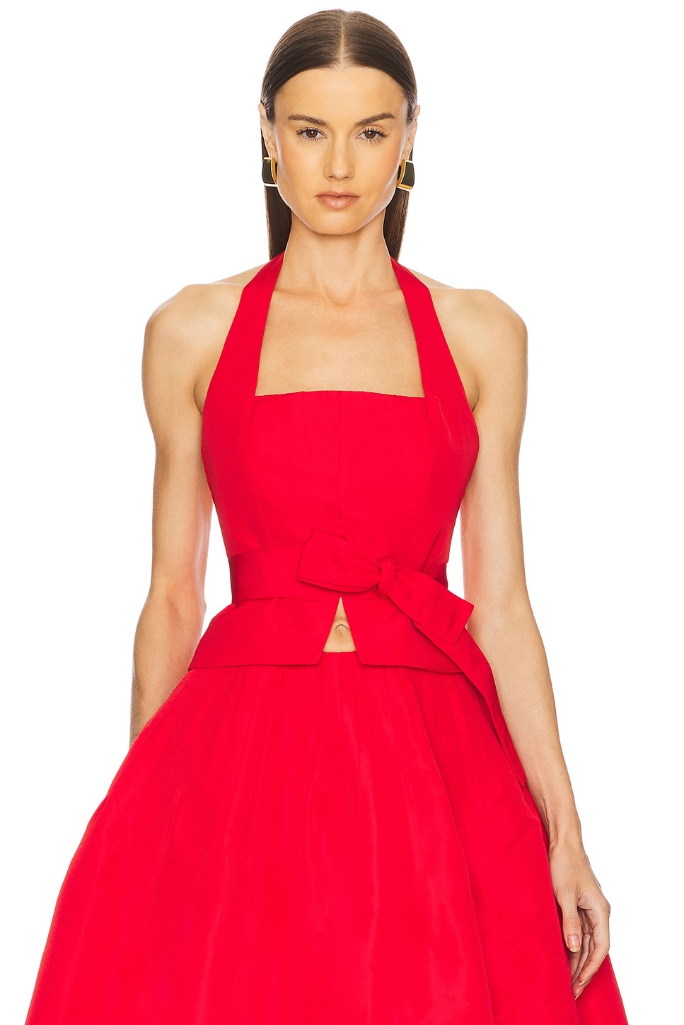 - Self: 96% cotton 4% elastane Contrast Fabric: 94% polyester 6% spandex - Made in China - Machine wash - Hidden back zip closure - Halterneck styling and front tie accent - Boned bodice - Lightweight poplin fabric - Item not sold as a set - Revolve Style No. CULG-WS217 - Manufacturer Style No. TP3307TF3008
