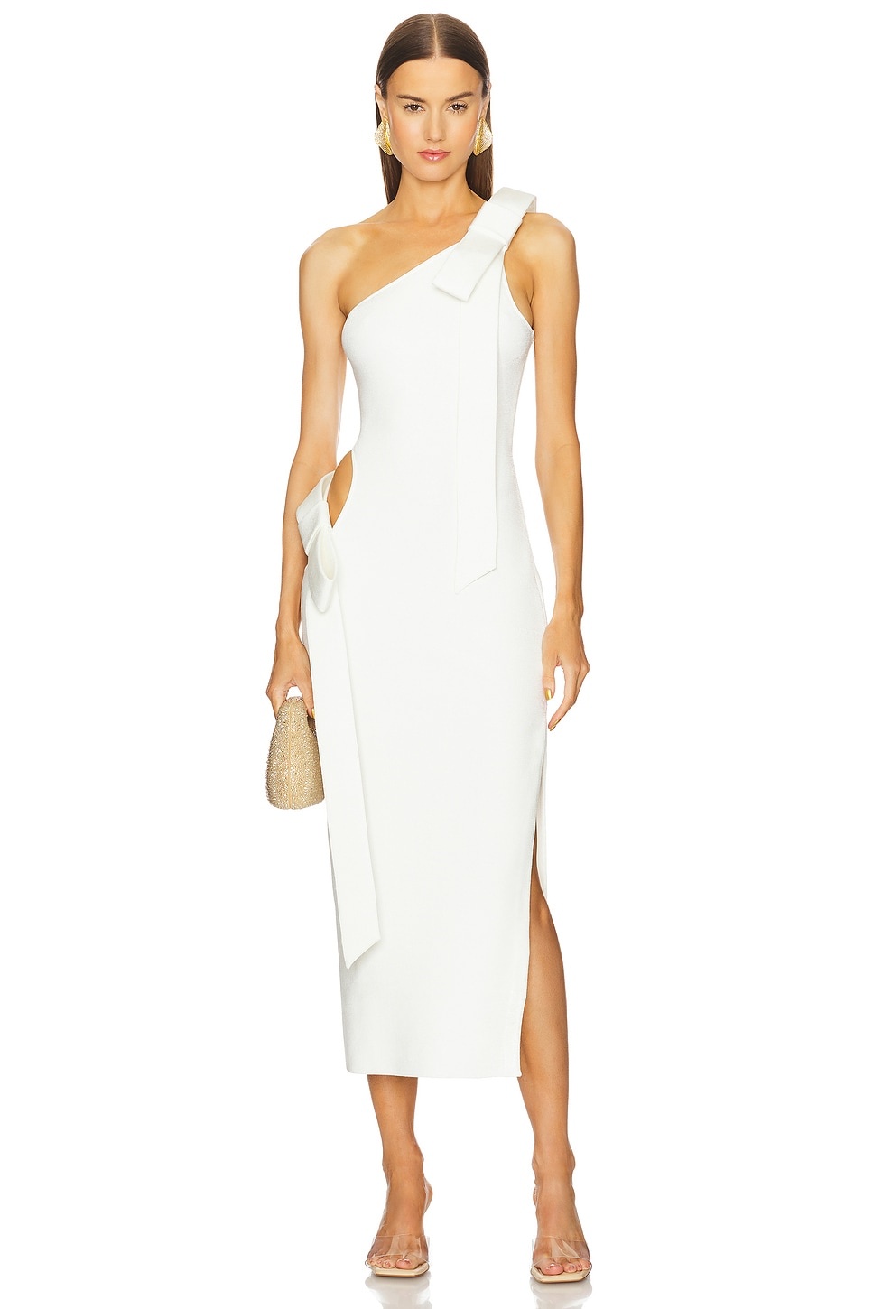 - 80% polyester 17% nylon 3% spandex - Made in China - Hand wash - Unlined - Hidden side zip closure - Cut-out design with bow accents - Ponte fabric with side slit - Revolve Style No. CULG-WD342 - Manufacturer Style No. KD3600YN2775