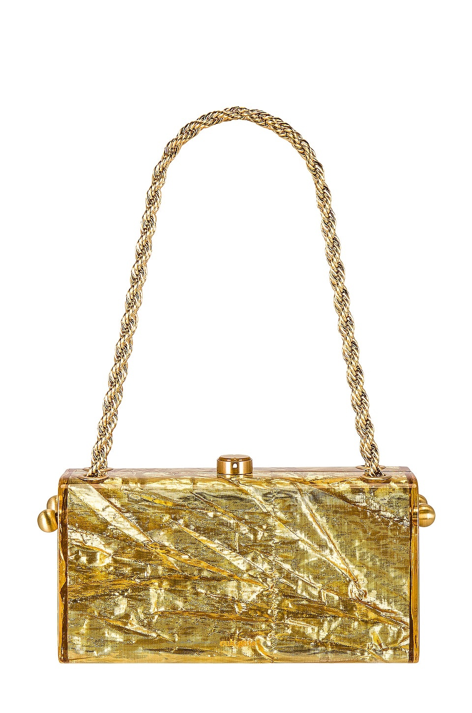 - Gold lam encased acrylic - Made in China - Top scooped lock closure - One main compartment - Twisted gold-tone metal shoulder straps - Measures approx 7.5" W x 4" H x 3.25" D Shoulder strap with a 7.25" drop - Revolve Style No. CULG-WY205 - Manufacturer Style No. SH2674P1