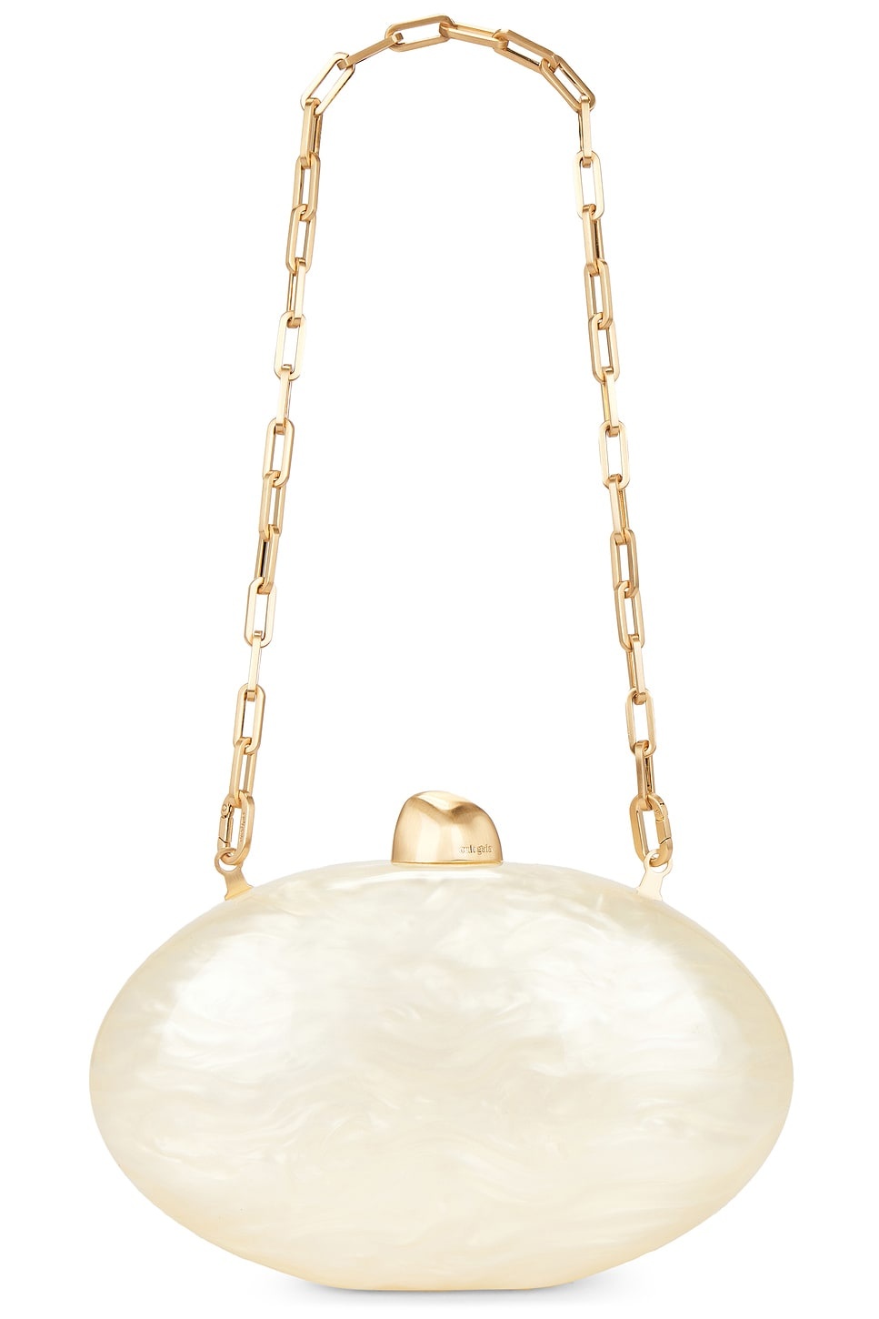 - Pearlized acrylic exterior and interior with gold-tone hardware - Top clasp closure - One main compartment - Removable chain strap - Measures approx 9.5" W x 6" H x 3" D Shoulder strap with a 11" drop - Revolve Style No. CULG-WY336 - Manufacturer Style No. CL3669AC3103