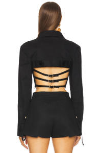 - Self: 97% cotton 3% spandex Lining: 100% polyester - Made in China - Machine wash - Front button closure - Buttoned cuffs - Lightweight twill fabric - Item not sold as set - Revolve Style No. CULG-WO11 - Manufacturer Style No. JT3774TW1491