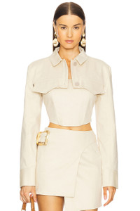 - Self: 97% cotton 3% spandex Lining: 100% polyester - Made in China - Machine wash - Front button closure - Buttoned cuffs - Lightweight twill fabric - Item not sold as set - Revolve Style No. CULG-WO10 - Manufacturer Style No. JT3774TW1491