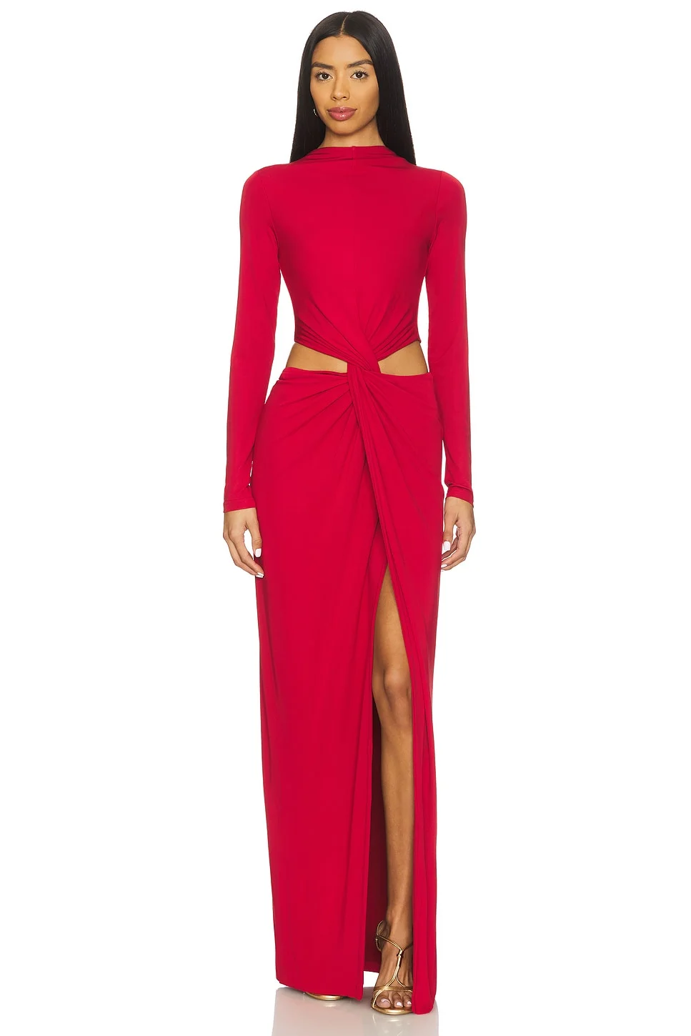 - 92% viscose 8% elastane - Hand wash - Fully lined - Hidden back zip closure - Front twist accent with wrap around cut-out - Front slit - Heavyweight jersey fabric - Revolve Style No. CULG-WD472 - Manufacturer Style No. DR1214JY1952