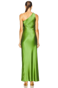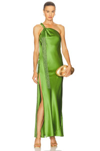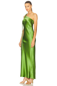 - Self & Lining: 92% silk 8% spandex - Dry clean only - Partially lined - Hidden side zip closure - One shoulder styling - Front beaded tassel accents - Midweight satin fabric with side slit - Revolve Style No. CULG-WD458 - Manufacturer Style No. GW28793SN1490