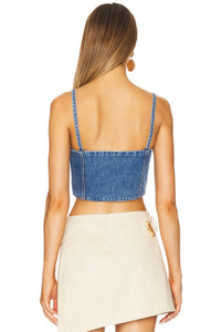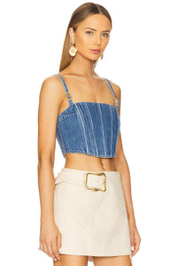 - Self: 100% cotton Lining: 100% cotton - Made in USA - Machine wash cold - Exposed side seam zipper closure - Adjustable straps with buckle closure detail - Fully boned and lined - Rigid denim - Revolve Style No. CULG-WS209 - Manufacturer Style No. TP3818DN2915