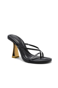 - Sheep leather upper with rubber sole - Imported - Slip-on styling - Leather footbed and lining - Strappy design - Rounded toe with gold-tone metal steel heel - Approx 90mm/ 3.5 inch heel - Revolve Style No. CULG-WZ189 - Manufacturer Style No. SD3265LR3056