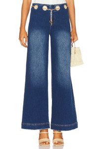 - 99% cotton 1% spandex - Made in China - Machine wash - Zip fly with button closure - Gold-tone ring cut-outs with detachable and adjustable gold-tone chain belt - Intentional fading - Midweight denim fabric.10.5" at the knee breaks to 24" at the leg opening - Revolve Style No. CULG-WP68 - Manufacturer Style No. PT2835CO