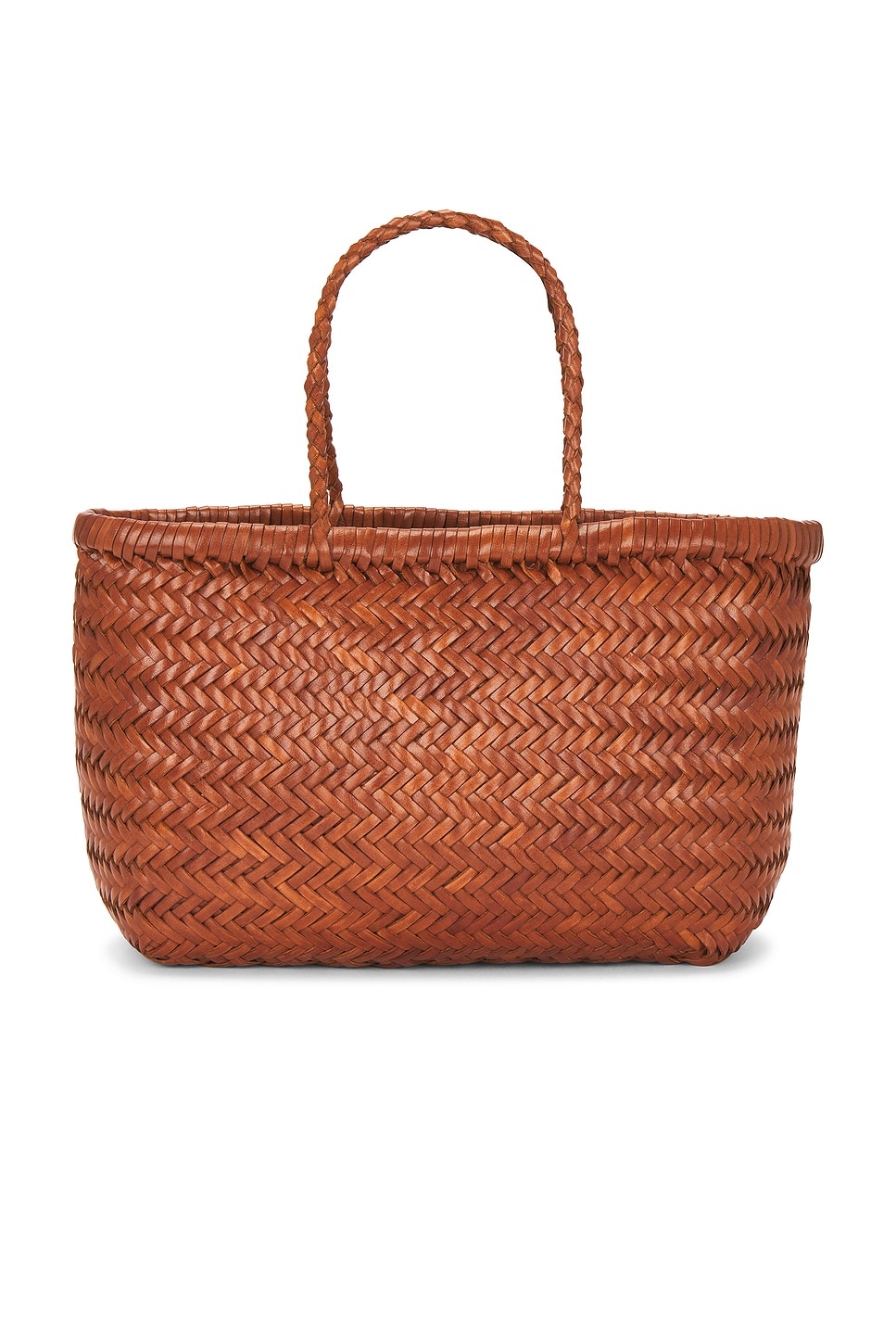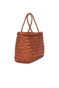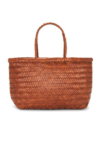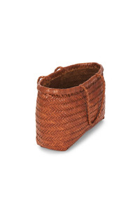 - Woven leather tote - Made in India - Open top - One main compartment - Dual braided top handles - Measures approx 8.5" W x 7" H x 3.25" D Top handle with a 5" drop - Revolve Style No. DRAR-WY4 - Manufacturer Style No. 8855