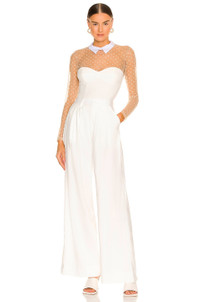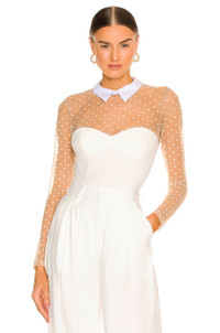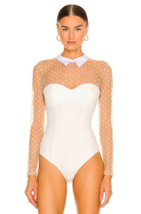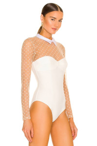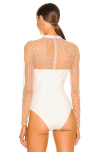- Self: 55% polyamide 40% cotton 5% elastane Contrast Fabric 1: 70% viscose 25% polyamide 5% elastane Contrast Fabric 2: 100% cotton Lining 1: 95% rayon 5% elastane Lining 2: 100% poly - Made in China - Dry clean only - Gusset snap button closure - Sheer tulle yoke and sleeves with polka dot accents - Partial back zipper closure - Revolve Style No. FLER-WS37 - Manufacturer Style No. BS0033