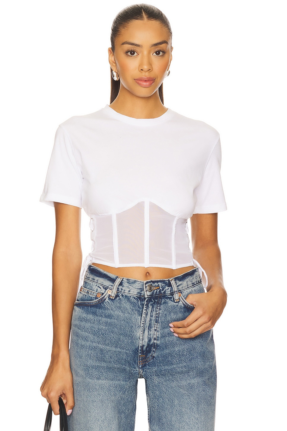 - Self: 100% cotton Contrast Fabric: 78% polyester 22% spandex - Machine wash - Side lace up closures with hidden back zip closure - Boned bodice - Cropped fit - Midweight jersey fabric with mesh contrast - Garment is made with a semi-sheer fabric, undergarments can show through - Revolve Style No. FLER-WS168 - Manufacturer Style No. TP0689