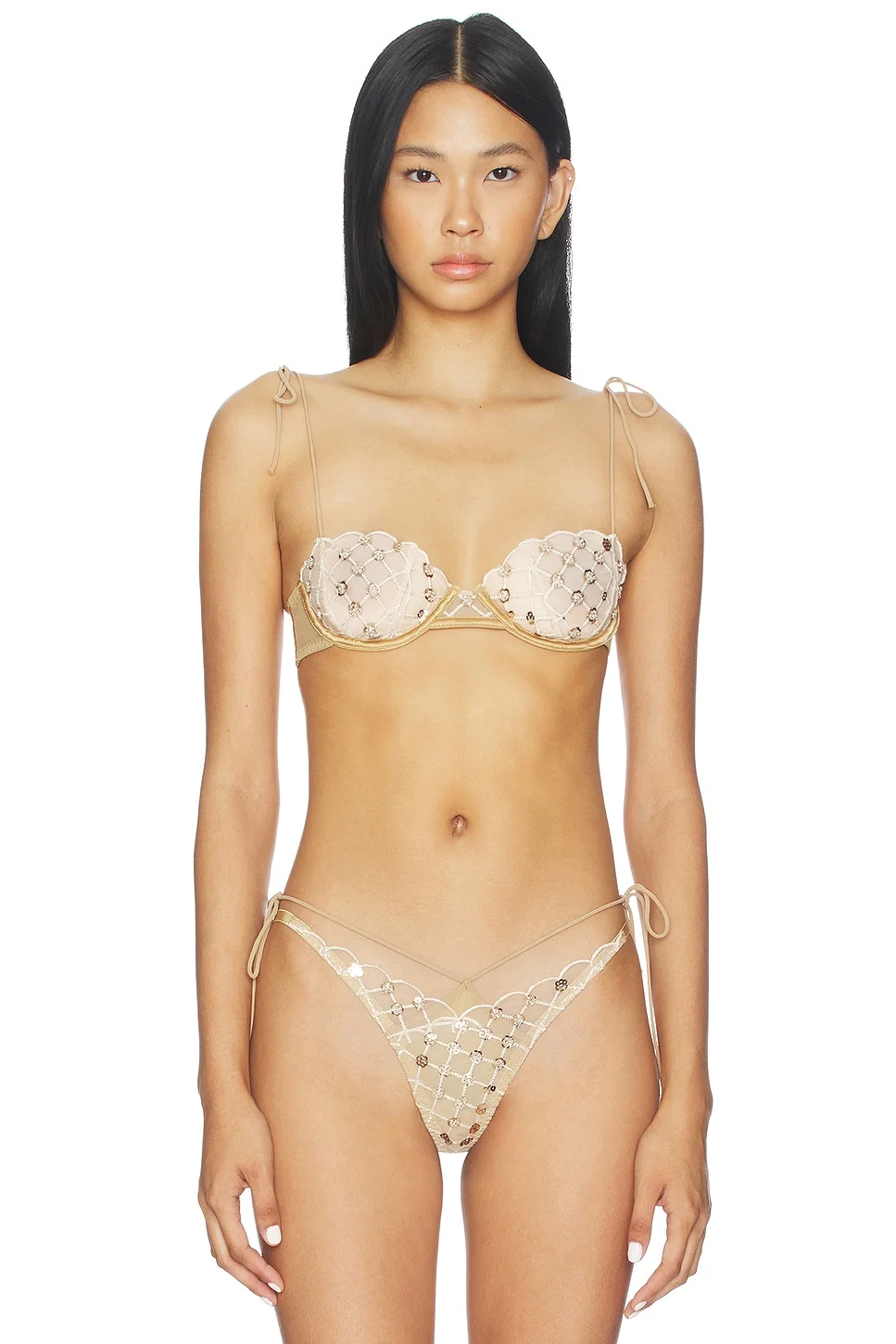 - 100% polyamide - Made in China - Hand wash cold - Back hook closure - Lightweight lace fabric - Self tie shoulder straps - Revolve Style No. FORL-WI564 - Manufacturer Style No. SKBR2137-HO25-GOLD