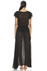 - Self: 100% viscose Contrast Fabric: 100% polyester - Dry clean only - Front button loop closure - Front double tie design - Tiered ruffle sleeves with lace trim - Midweight chiffon fabric - Garment is made with a semi-sheer fabric, undergarments can show through - Revolve Style No. FORL-WI559 - Manufacturer Style No. SKSP2160-HO25-BLACK