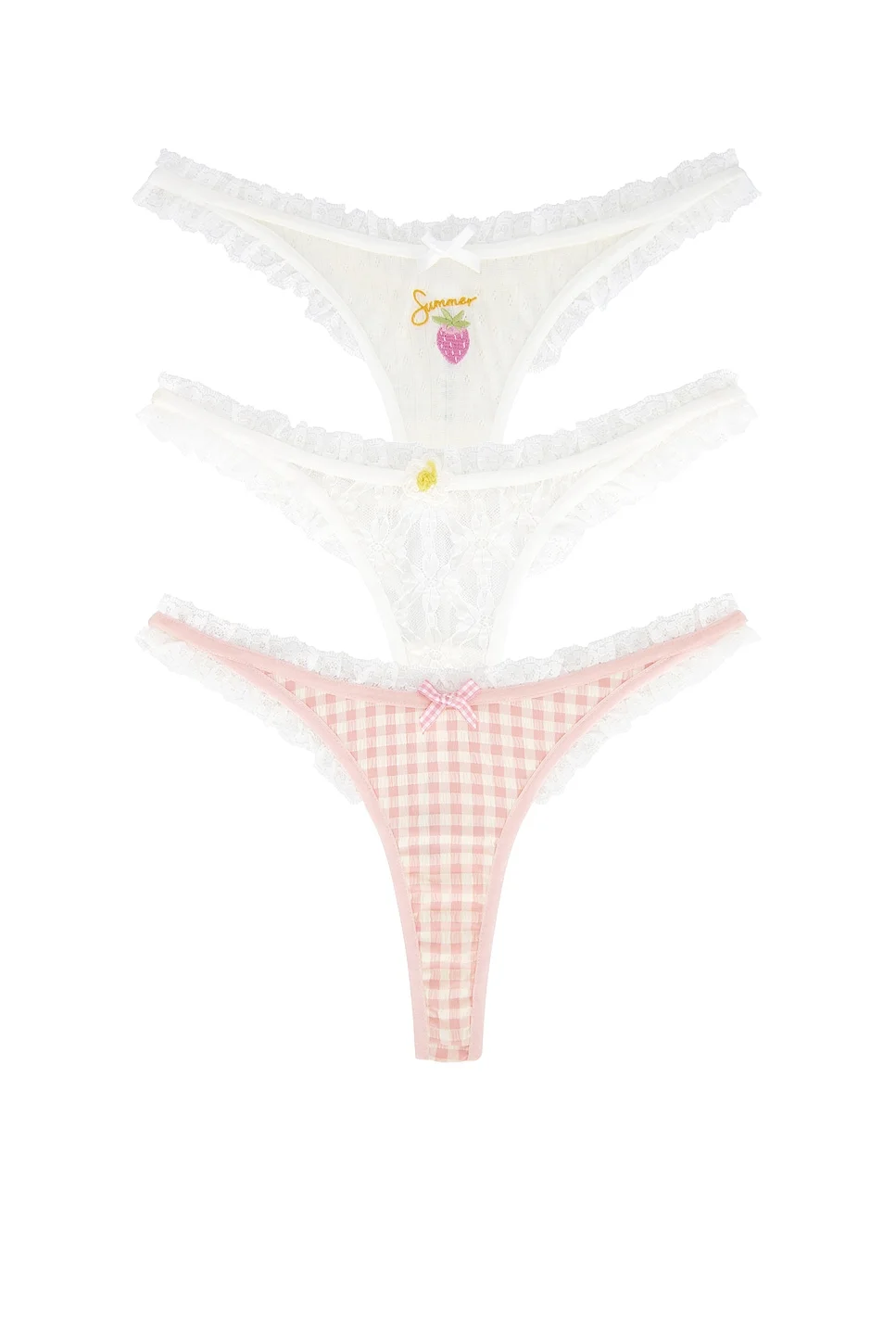 - Pink Thong - Self: 98% polyester 2% elastane Gusset: 100% viscose Summer Thong - Self: 100% polyester Gusset: 100% viscose Lace Thong - Self: 86% polyamide 14% elastane Gusset: 100% viscose - Machine wash cold - Crochet and ribbon trim - Lightweight seersucker, knit, and lace fabrics - Sold as a set of 3 - Revolve Style No. FORL-WI486 - Manufacturer Style No. SKPA1980-SU25