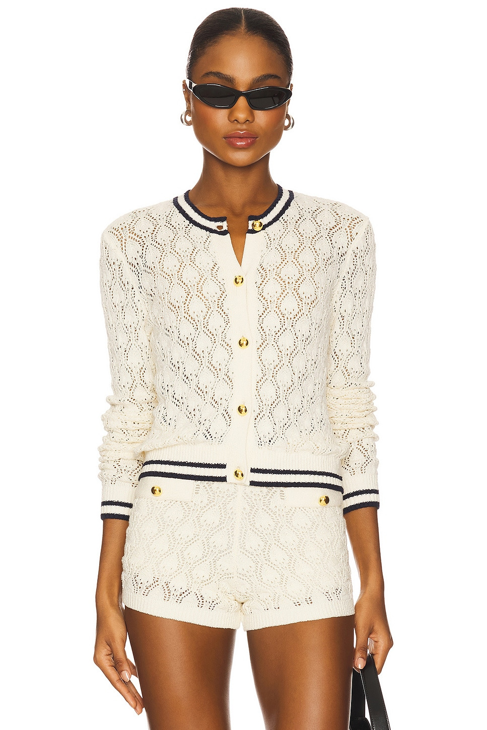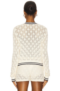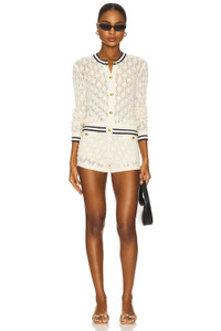 - 75% cotton 25% polyester - Dry clean recommended - Front button closures - Ribbed trim - Midweight knit fabric with lace detailing - Item not sold as set - Garment is made with a semi-sheer fabric, undergarments can show through - Revolve Style No. FAME-WK82 - Manufacturer Style No. WE25KSW026