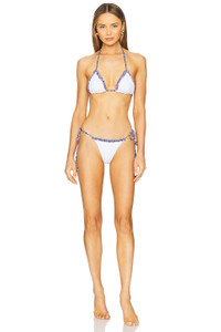 - 80% nylon 20% spandex - Made in Colombia - Hand wash - Unpadded cups - Halterneck and back tie closure - Lightweight swimwear fabric with floral trim - Item not sold as a set - Revolve Style No. FRBI-WX1292 - Manufacturer Style No. 10168EY
