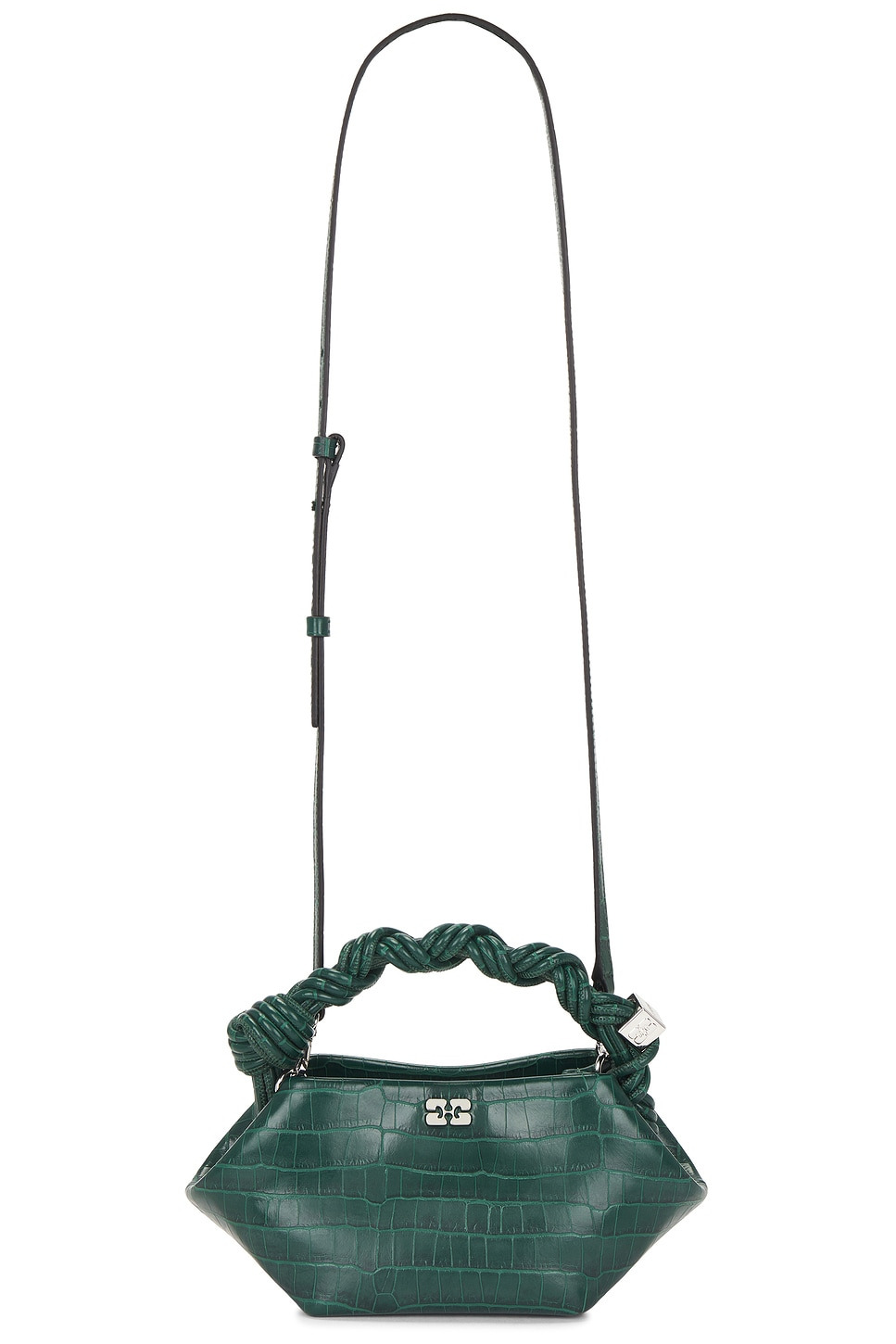 - Croc leather blend exterior with twill lining - Top magnetic button closure - One main compartment - Interior card slot - Integrated woven and braided top handle with signature Ganni cube - Detachable and adjustable shoulder strap - Measures approx 5" W x 4.5" H x 4" D Shoulder strap with a 20.5" drop Top handle with a 2.5" drop - Revolve Style No. GANR-WY124 - Manufacturer Style No. A6748