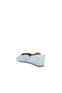 - Denim upper with manmade sole - Slip-on styling - Faux leather footbed and lining - Gold-tone Ganni hardware at vamp - Angled square toe with wedge heel - Approx 45mm/ 1.75 inch wedge - Revolve Style No. GANR-WZ140 - Manufacturer Style No. S3049