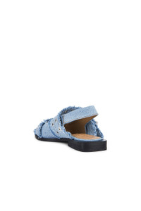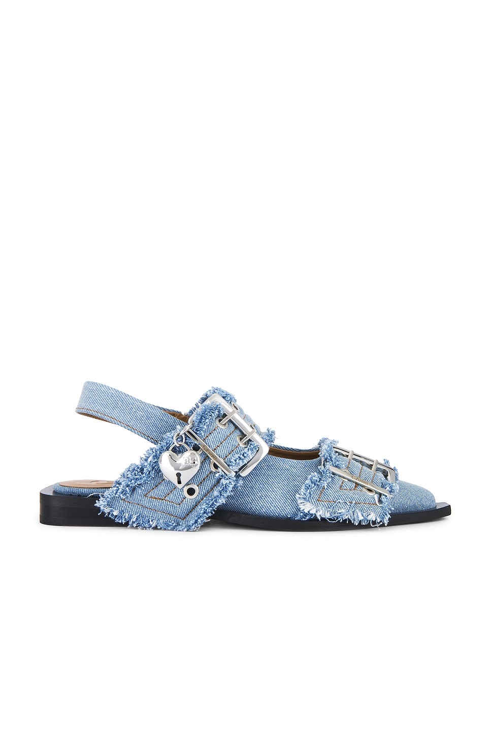 - Denim upper with manmade sole - Slingback styling - Cushioned faux leather footbed and lining - Adjustable silver-tone buckle straps with grommet detailing - Detachable silver-tone metal heart charm - Pointed toe - Revolve Style No. GANR-WZ135 - Manufacturer Style No. S2939