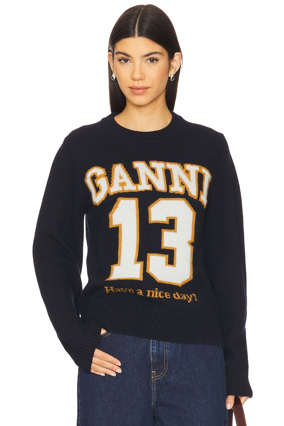 DARK BLUE GRAPHIC WOOL MIX BASEBALL SWEATER