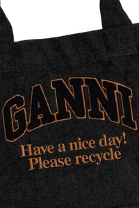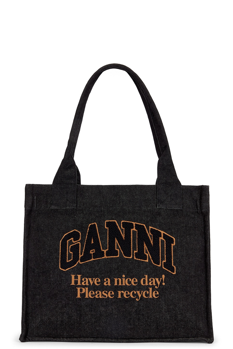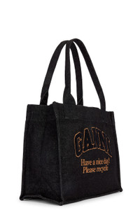 - Unlined canvas tote - Open top - One main compartment - Embroidered Ganni logo at front with novelty phrasing and terrycloth - Integrated shoulder straps - Measures approx 14.5" W x 12" H x 7" D Shoulder strap with a 10" drop - Revolve Style No. GANR-WY132 - Manufacturer Style No. A6583