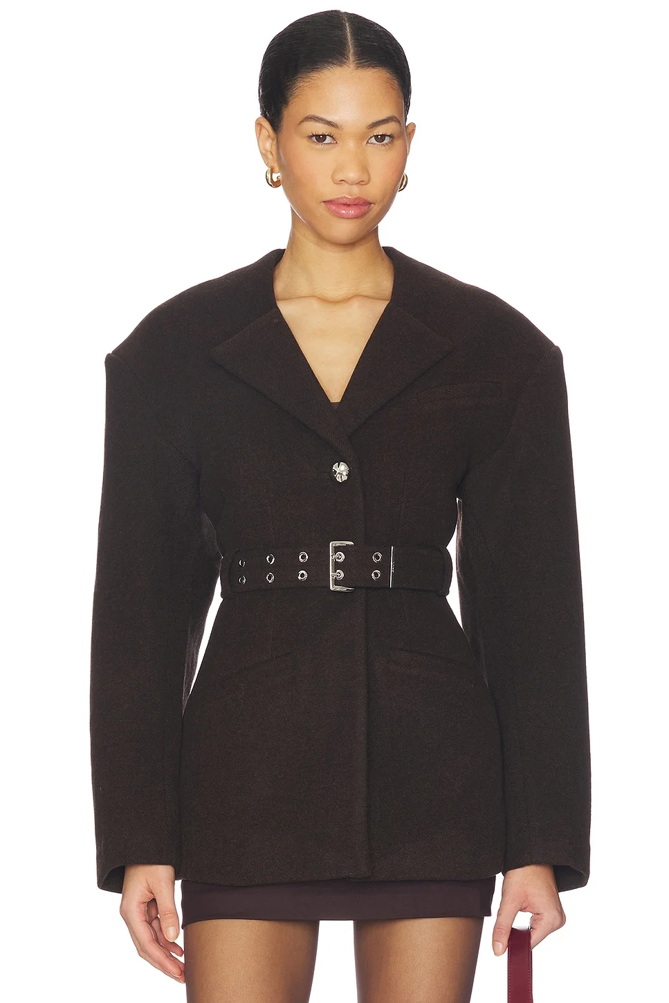 - Self: 72% wool 23% polyester 5% cashmere Lining: 57% acetate 43% viscose - Made in China - Dry clean - Front button closure - Adjustable belt - Heavyweight wool fabric - Front welt pockets - Revolve Style No. GANR-WO37 - Manufacturer Style No. A1010043