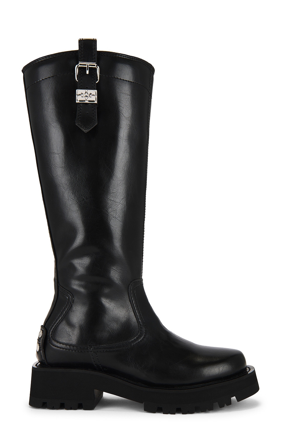 - Faux patent leather upper with manmade sole - Side zipper closure - Faux leather footbed and lining - Buckled side pull-tab with silver-tone metal Ganni hardware - Almond toe - Approx 45mm/ 1.75 inch heel Approx 25mm/ 1 inch platform Approx 349mm/ 13.75 inch shaft Opening measures approx 20.41" in circumference - Revolve Style No. GANR-WZ146 - Manufacturer Style No. S3022
