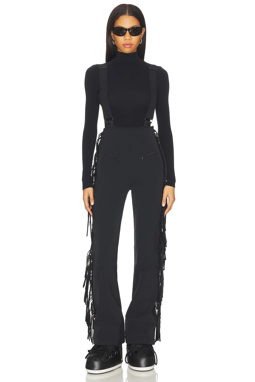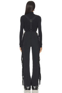 - 49% polyester 30% polyamide 12% polyurethane 9% elastane - Made in China - Machine wash cold - Side zipper closure with suspenders - Front panel pocklets with zip closure - Fully-lined legs - Fringe side paneling.18" at leg opening - Revolve Style No. GDBE-WC51 - Manufacturer Style No. GE00168254