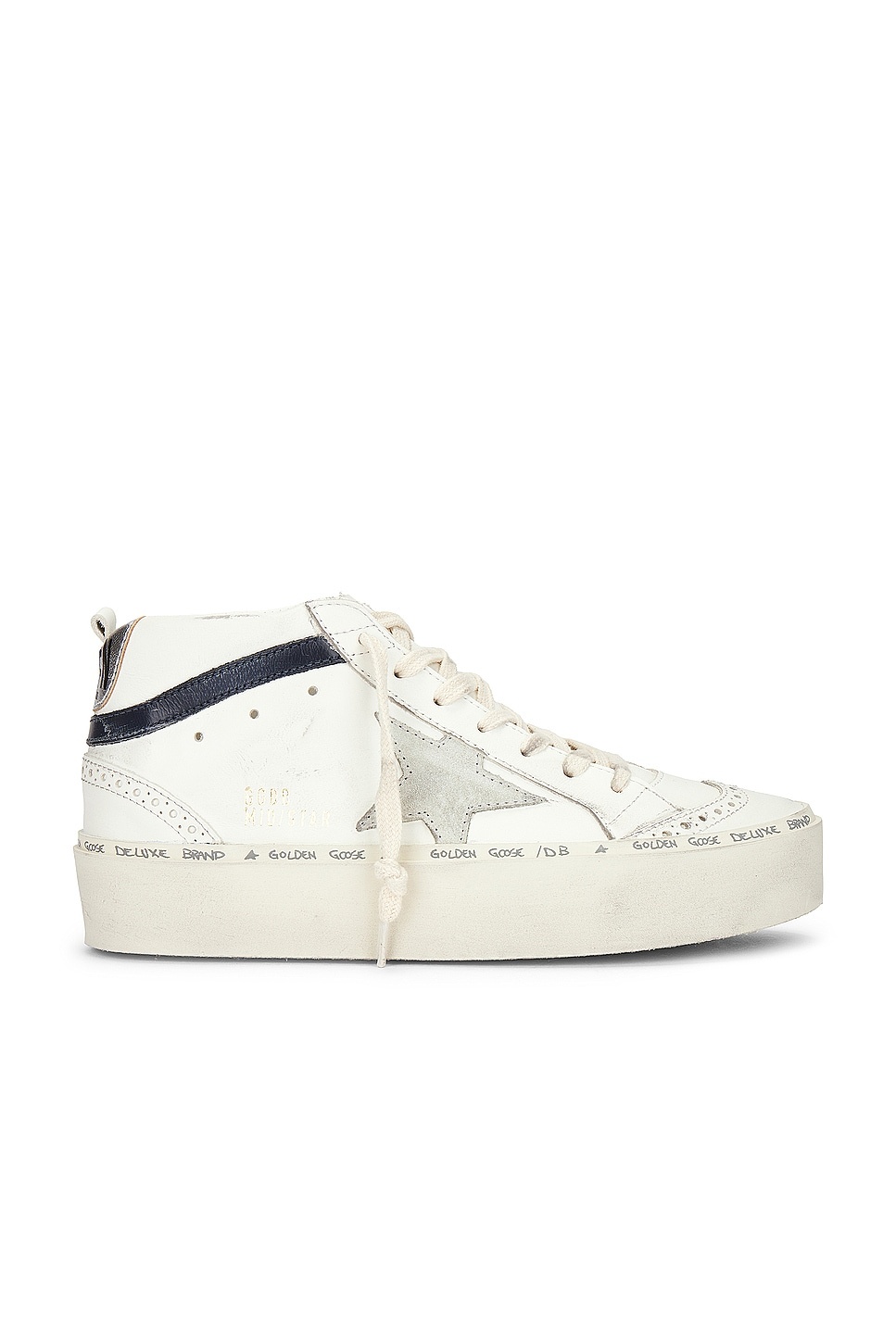 - Leather upper with suede trim and rubber sole - Made in Italy - Lace-up front - Suede star patch at side panels - Embossed gold-tone Golden Goose Mid Star logo at side panel - Leather and French terry lining - Back pull-tab Intentionally scuffed and distressed - Approx 32mm/ 1.25 inch platform - Revolve Style No. GGOR-WZ600 - Manufacturer Style No. GWF00699.F005653.10558