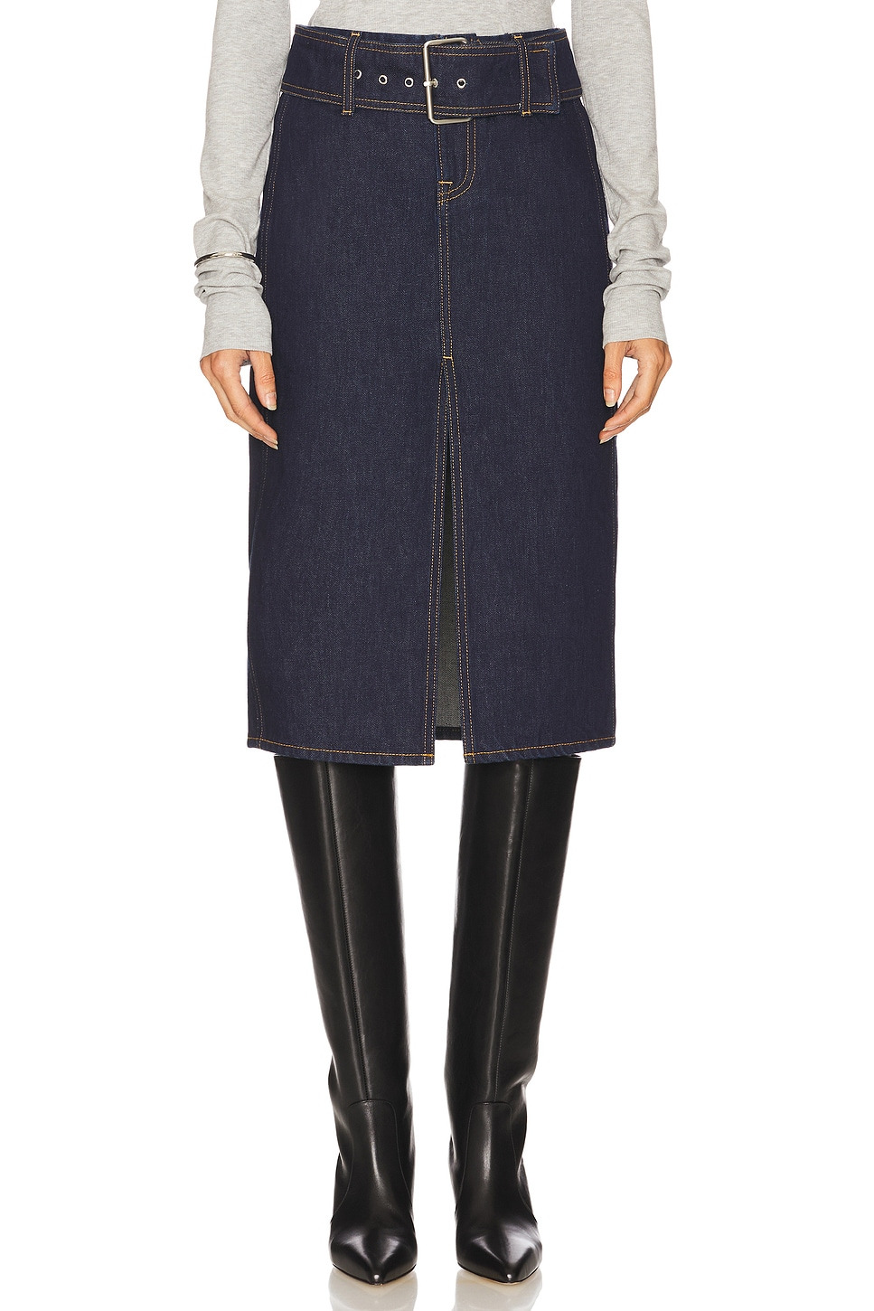 - 100% cotton - Made in USA of imported materials - Machine wash cold - Unlined Zip fly with button closure - Detachable belt with silver-tone buckle closure - Midweight rigid denim fabric with contrast stitching detailing - Skirt measures approx 27.5" in length - Revolve Style No. GRLR-WQ129 - Manufacturer Style No. GFQ10003 F25