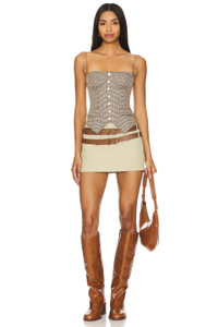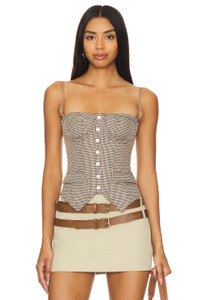 - Self: 96% polyester 4% spandex Lining: 95% polyester 5% spandex - Made in China - Hand wash - Back lace-up tie closure - Boned bodice - Front button detail - Detachable and adjustable shoulder straps Front flap welt pockets - Lightweight gabardine fabric - Revolve Style No. DGUI-WS150 - Manufacturer Style No. P24114W087