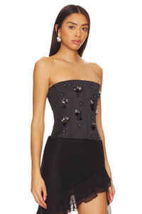 - 97% polyester 3% spandex - Made in China - Hand wash - Front hook and eye closure - Back lace-up tie closure - Boned bodice with tonal bead and sequin embellishments - Satin fabric - Revolve Style No. DGUI-WS122 - Manufacturer Style No. C00109W037