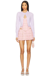 - Self: 89% polyester 5% chinlon 3% wire 3% sequins Lining: 90% rayon 10% spandex - Hand wash - Fully lined with attached short - Hidden side zip closure - Front pleated detailing - Midweight tweed fabric - Item not sold as a set - Skirt measures approx 10" in length - Revolve Style No. DGUI-WF26 - Manufacturer Style No. S25310W131